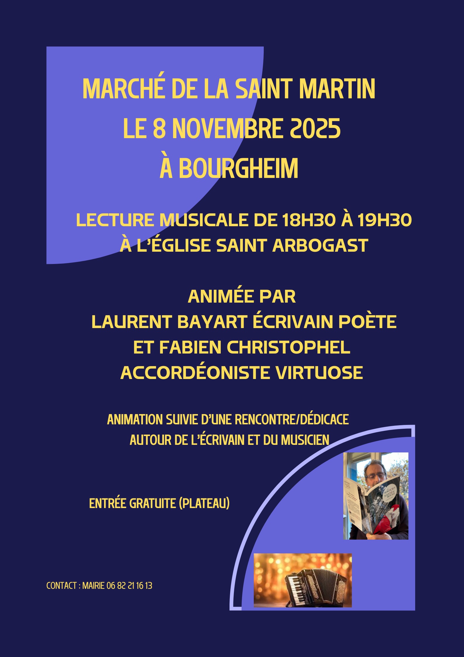 Dans le cadre du Marché de la Saint Martin de Bourgheim, Laurent Bayart proposera une lecture musicale avec l’accordéoniste Fabien Christophel, autour de ses deux derniers ouvrages : « Le soleil danse sur mon jardin » et « Le Magicien en manteau rouge » dans le cadre de ses cinquante ans d’écriture.