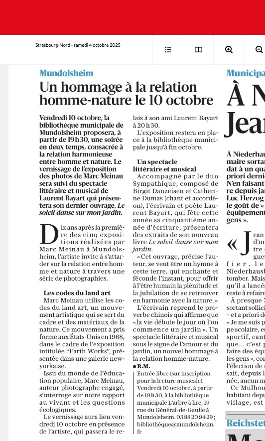 - Apéro littéraire et musical dans les jardins d’la Bib à Mundolsheim, DNA du 19 juin. 2019, article de Jean-Marie Weidmann.