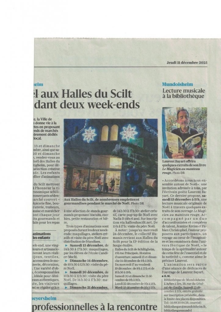 - DNA, le 13 décembre 2023, lecture musicale de Noël à la bibliothèque de Mundolsheim.